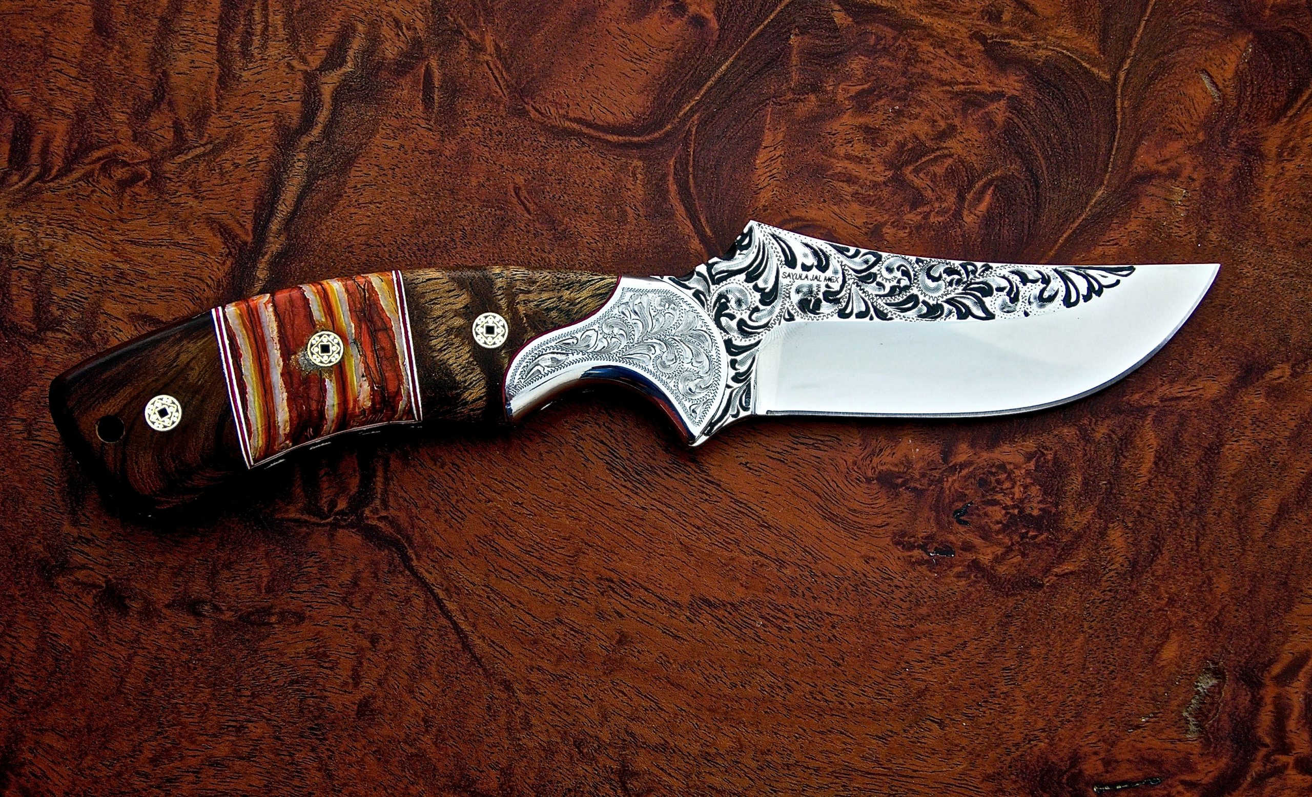 Cuchillo Rhino Combinado, Acero: Elmax. Cacha: Muela de Mamut, Raiz de Mesquite y Madera. con pernos decorados y almenillado en mango y lomo, grabado en hoja, incluye funda en piel de ternera.