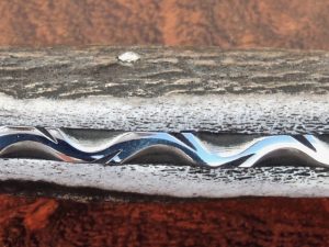 Cuchillo Ojeda. Modelo Ganchito 2. Acero: PM 154. Cacha: Asta de ciervo Rojo. Almenillado en contorno de la pieza, Incluye funda en piel de ternera.