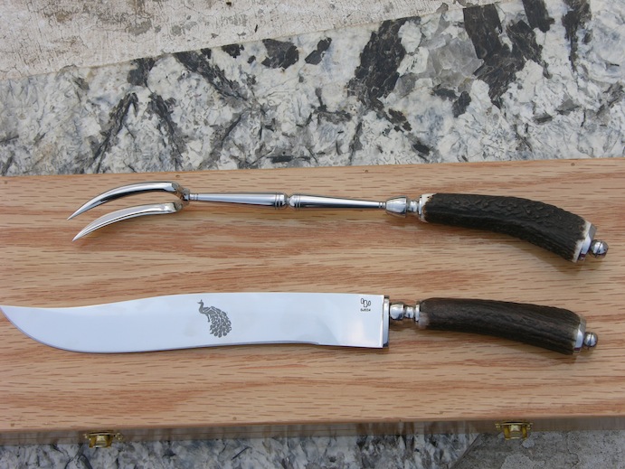 Juego para pavo o asado, en acero inoxidable 420, con mango de asta de ciervo rojo y cuchillo grabado con pavo real, incluye estuche de madera.