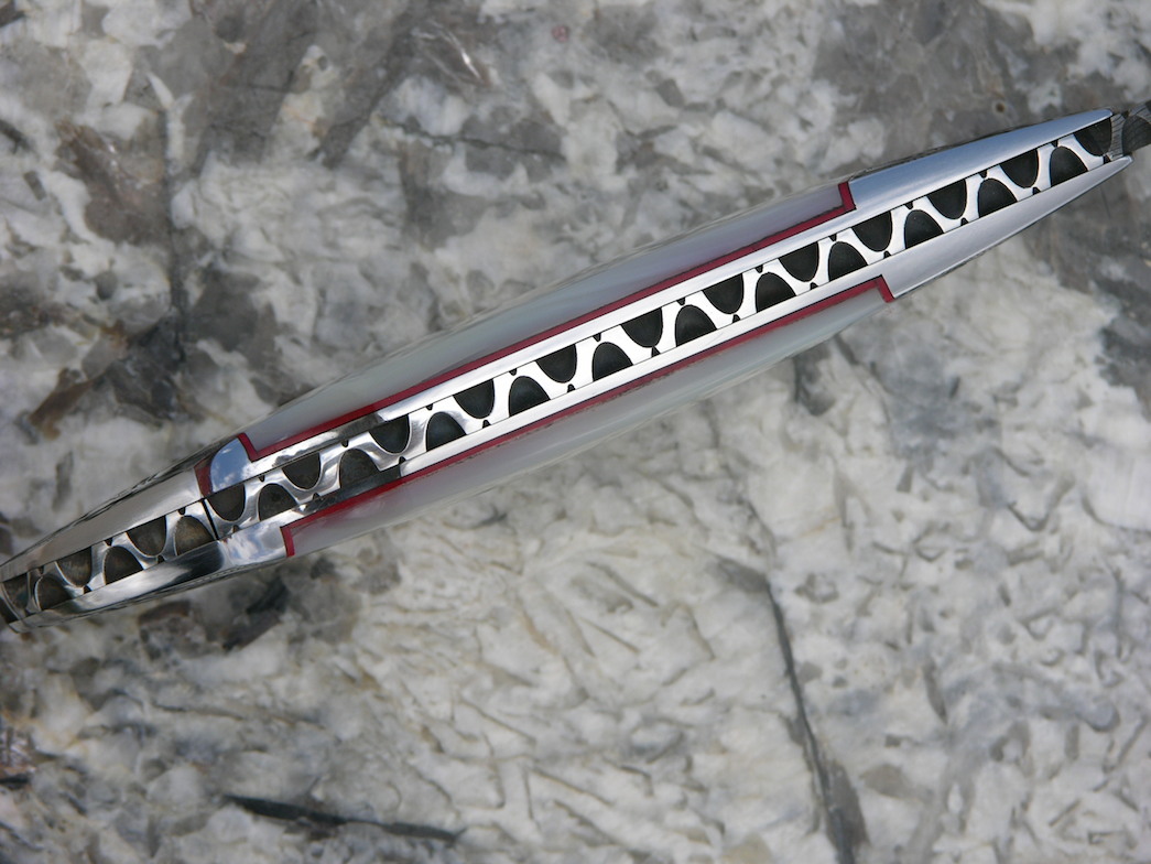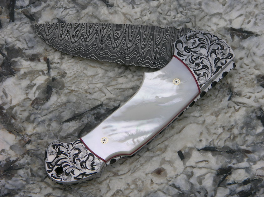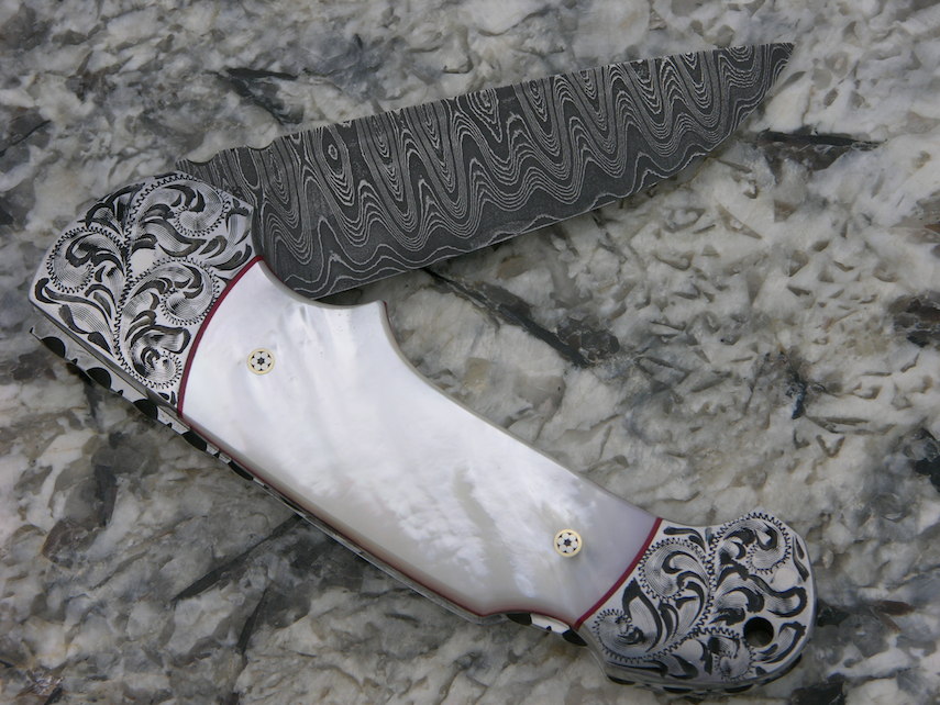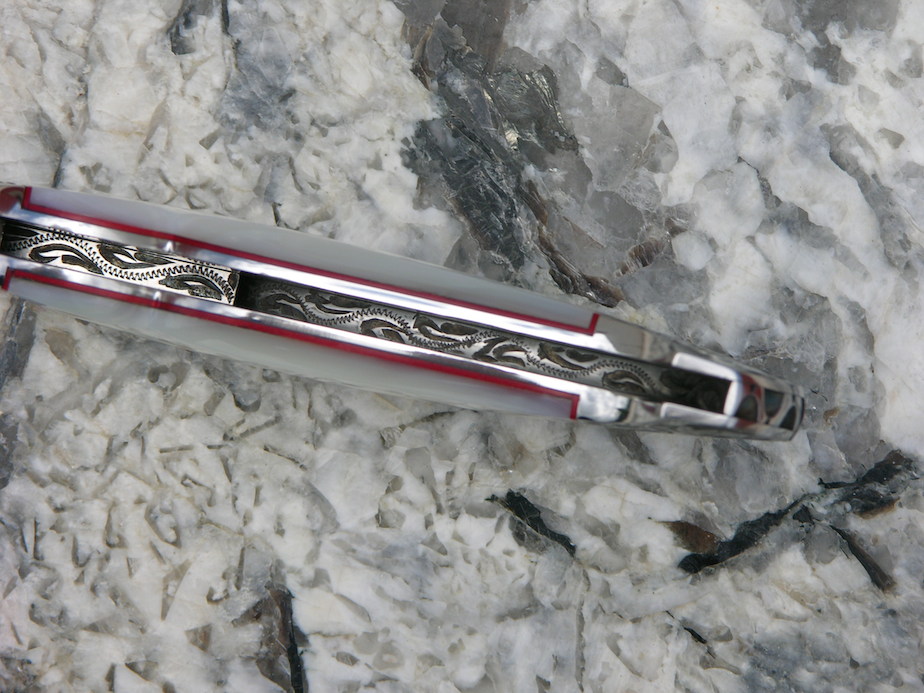 Navaja Ojeda Mediana, Acero: Damasco. Cacha: Madre perla, con pernos decorados, grabado en mitras y almenillado en lomo, incluye funda en piel de tiburon.