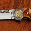 Navaja Ojeda Mediana, Acero: Damasco. Mango: Asta de ciervo rojo, grabado especial en mitras con perdices en oro de 18 kilates, almenillado, incluye funda en piel de tiburon.